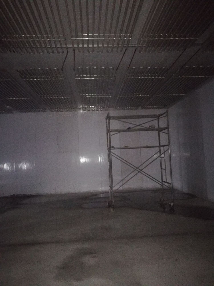 冷庫采用120mm聚氨酯保溫板雙面彩鋼板,地面鋪設(shè)100mm擠塑板后鋪設(shè)100mm水泥。